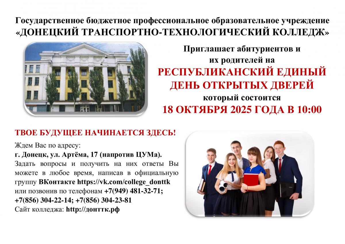 В рамках реализации Плана мероприятий Республиканской акции «Учиться в Донбассе» 14 октября 2025 года в Донецком транспортно-технологическом колледже состоялось профориентационное мероприятие «Один день в колледже».