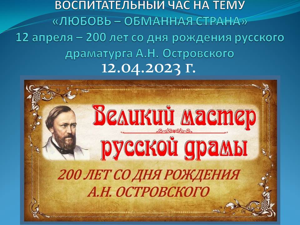 12.04.2023 г. во всех учебных группах дистанционно был проведен воспитательный час «Любовь - обманная страна», посвященный 200-летию со дня рождения русского драматурга А.Н.Островского, главной целью которого было расширить знание о творчестве русского драматурга.